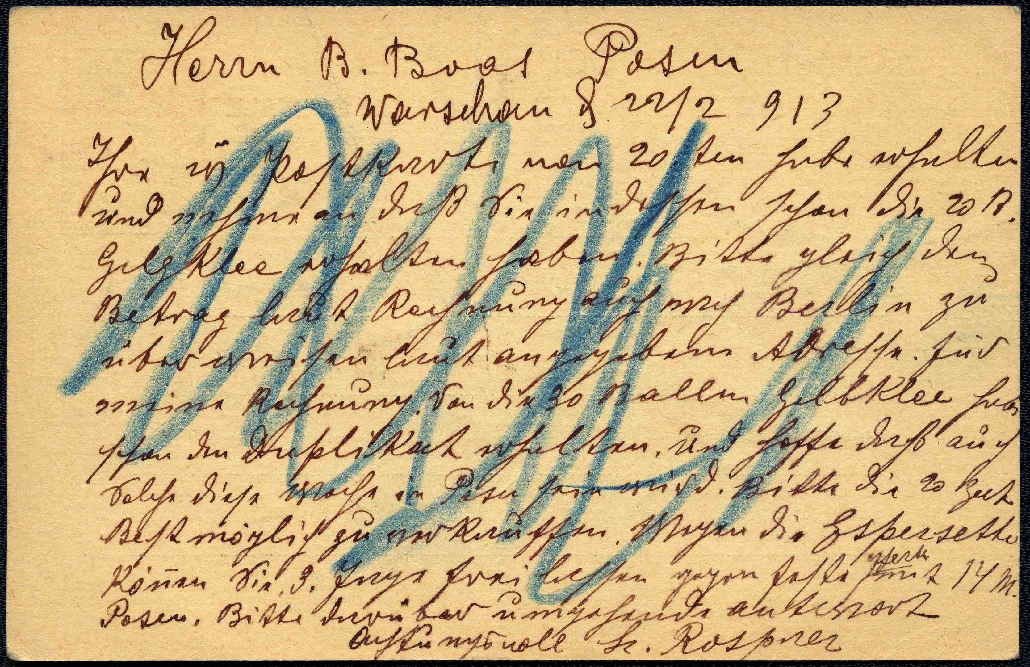 Es handelt sich um eine Postkarte vom 10. Februar 1913, also während der Teilung Polens, aus Warschau nach Posen. Beide polnischen Städte lagen zur damaligen Zeit in zwei verschiedenen Staaten. Warschau (Warszawa) in Russland und Posen (Poznań) im Deutschen Reich.