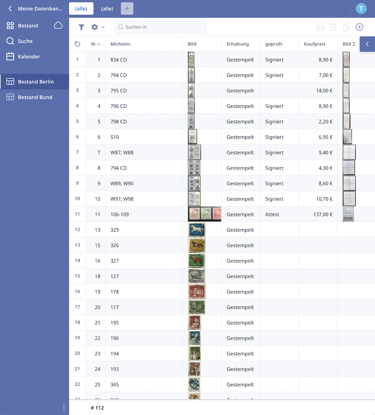 Für die Datenbank nutze ich Ninox. Das ist ein Datenbanksystem, das du für alles denkbare einsetzen kannst und nicht nur für Briefmarken. Die Eingabe- und Ausgabefelder kannst du beliebig selbst zusammenstellen. Apps gibts für iOS, iPad, MacOS und im Abo auch für den Webbrowser systemunabhängig. Anbei drei Screenshots aus meinen Datenbanken. Bei dir kann es ganz anders aussehen, mit mehr oder weniger und völlig anderen Eingabefeldern und -möglichkeiten.