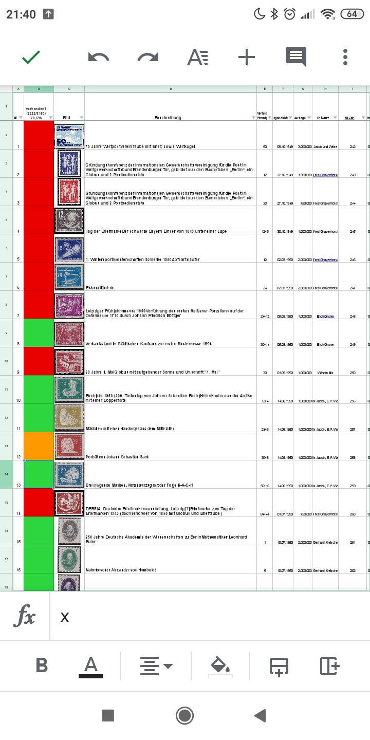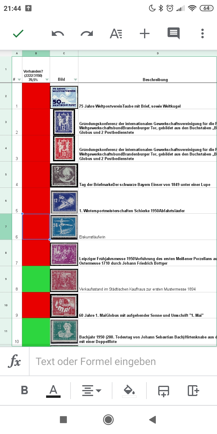 Anbei zwei Screenshots des Tabellenanfangs (grün heißt ist in Bestand, rot fehlend, man kann natürlich auch noch Qualitätsabstufungen machen oder was auch immer, mit reicht das vorerst so).