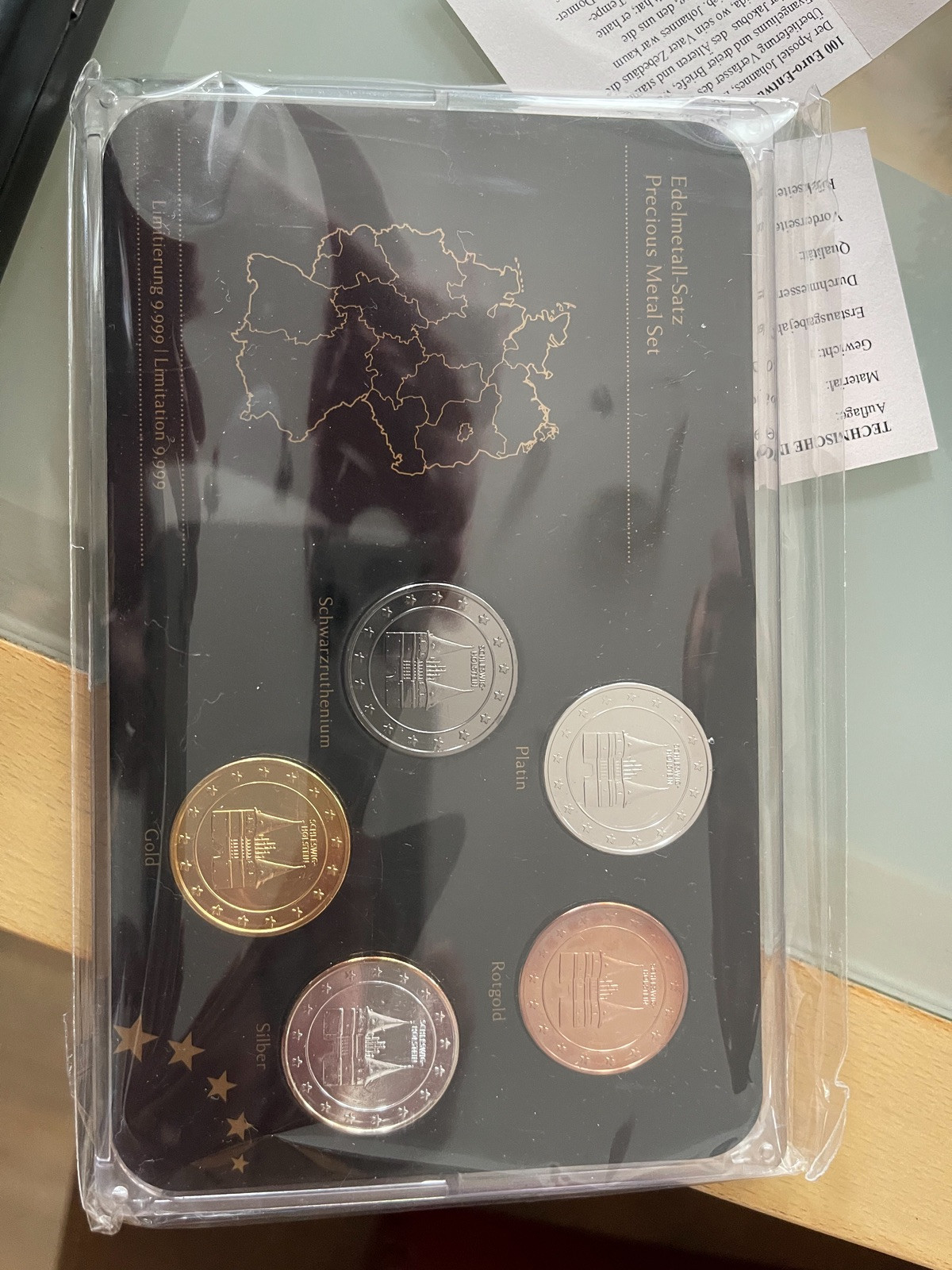 Die 4 Münzen in der Schatulle sind 1x Stempelglanz, 1x polierte Platte. Die anderen beiden nicht aus Gold, sondern die Köpfe vergoldet. Wie sollte es technisch anders gehen?