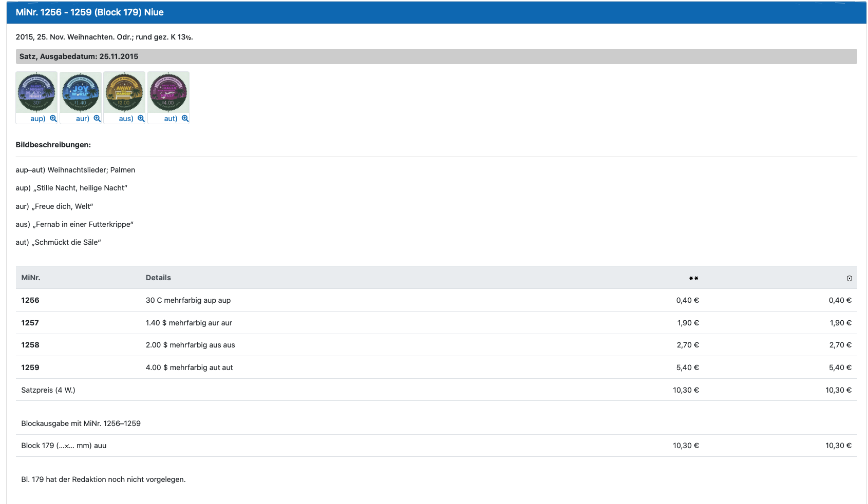 ich suche bisher vergebliche eine Michel-Nummer einer Ausgabe von 2015 aus Niue. Ist also schon ein wenig her und mich wundert es, dass ich dies nicht finde. Hat Michel die wirklich nicht gelistet?