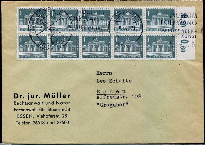 Natürlich ist dieser Brief philatelistisch motiviert, er ging ja auch an einen Briefmarkenversand als Empfänger... Ich finde ihn trotzdem (oder gerade deshalb) optisch sehr gelungen. Besonders schön ist auch, dass ein Ober- und ein Unterrand vom Bogen erhalten geblieben sind.
