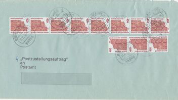 Auf dem Beleg von hubtheissen (#397) sind hingegen für 5 Postzustellungsaufträge "nur" 45 DM frankiert. Dieser Beleg ist vom 27.9.1993.