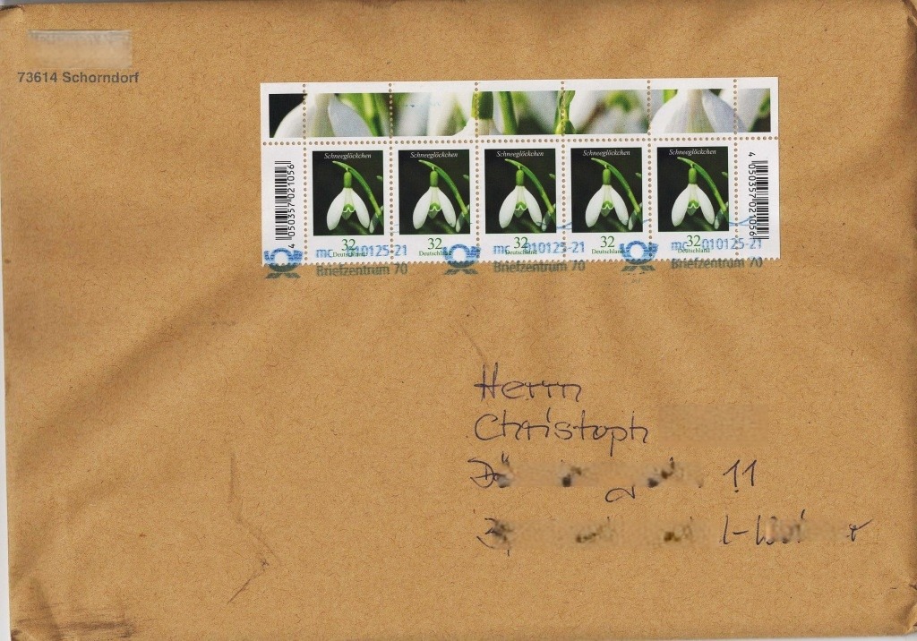 Prost Neujahr! Heute in meinem Briefkasten mit Stempel vom 1.1.2025. Einen Tag früher war er noch portogerecht, mit dem Jahreswechsel wären eigentlich 20 cent mehr fällig gewesen. Es gibt da wohl eine "Karenzzeit". So konnte mein Tauschpartner nochmal diese sehr ästhetische Mehrfachfrankatur (5x 0,32 = 1,60 €) auf den Weg schicken.