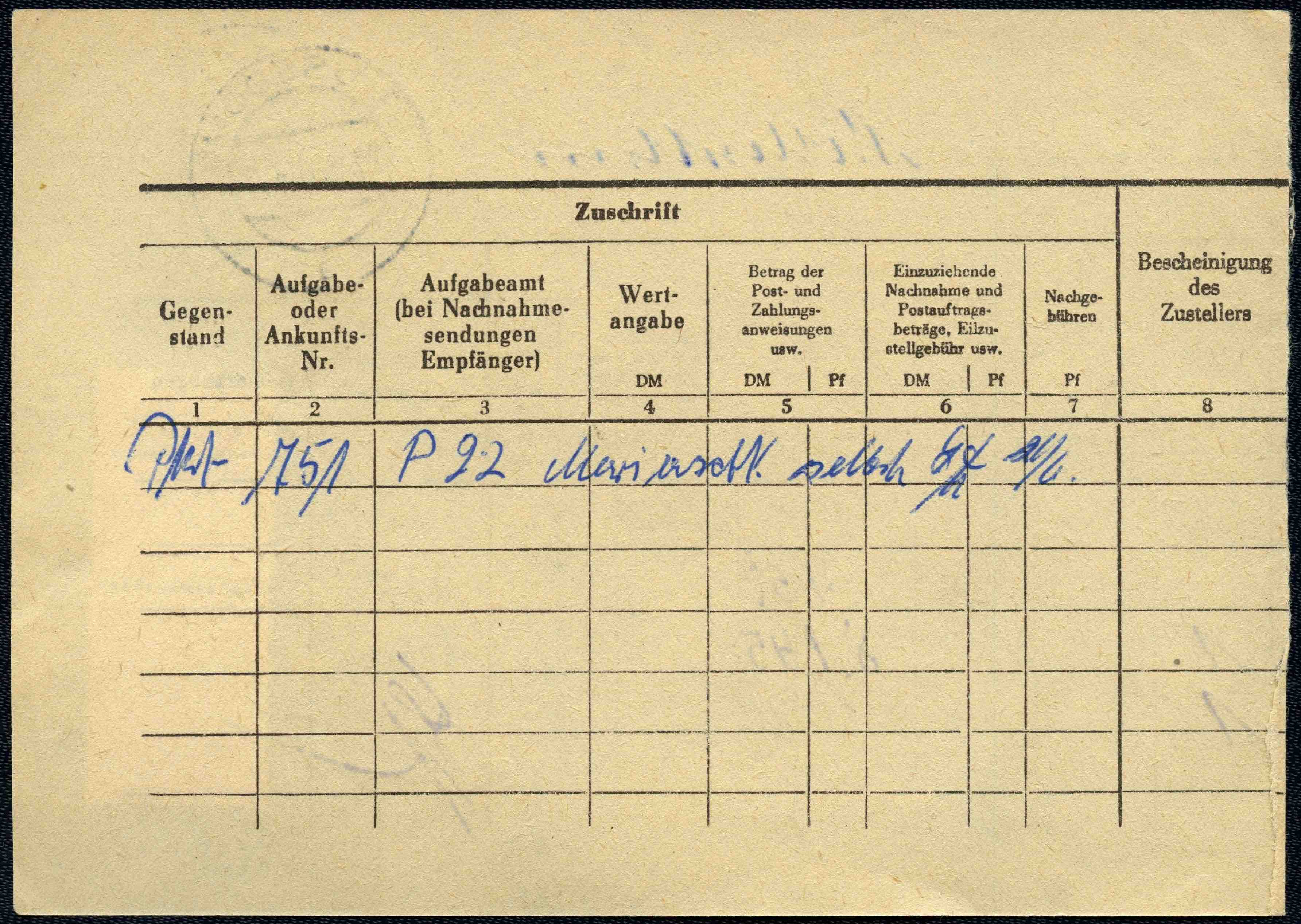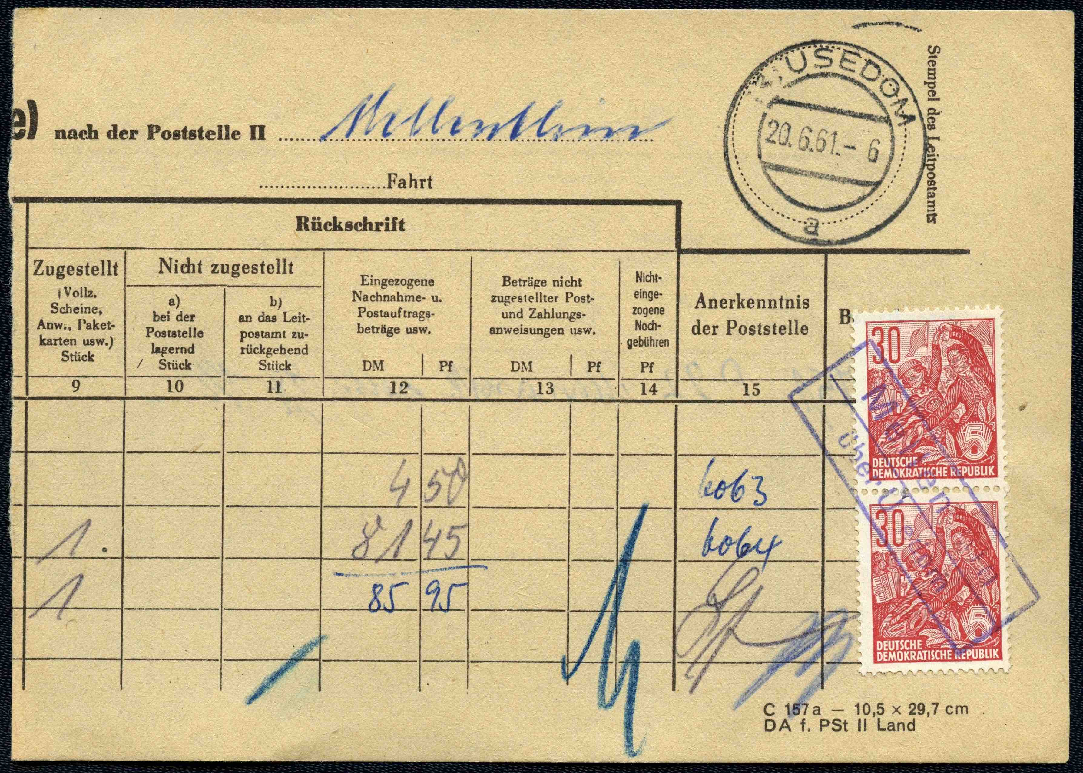 Hierbei handelt es sich um einen Teil einer Überweisungskarte (Zustellkarte), mit welcher die Zustellgebühr für Pakete im Landzustellbereich Usedom (Poststelle II Kamminke) abgerechnet wurde.