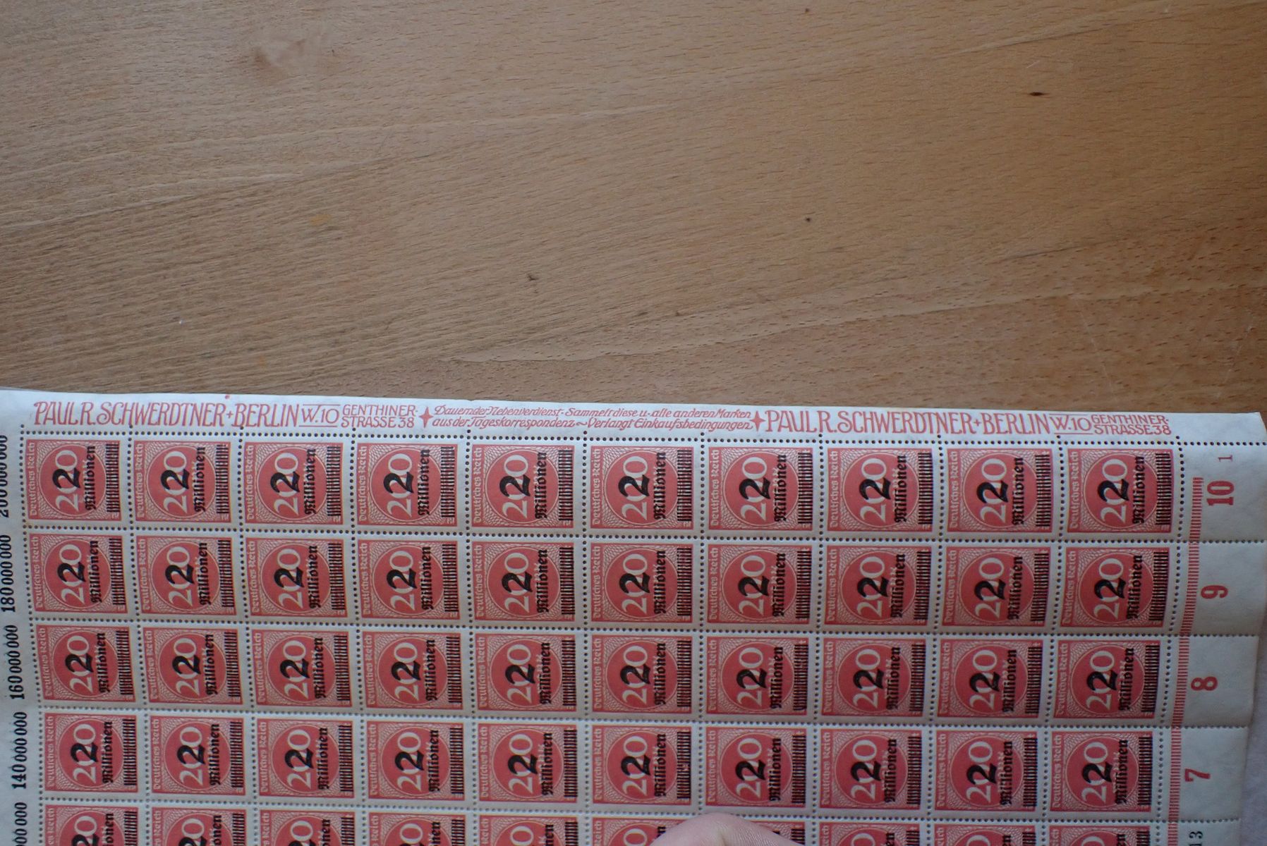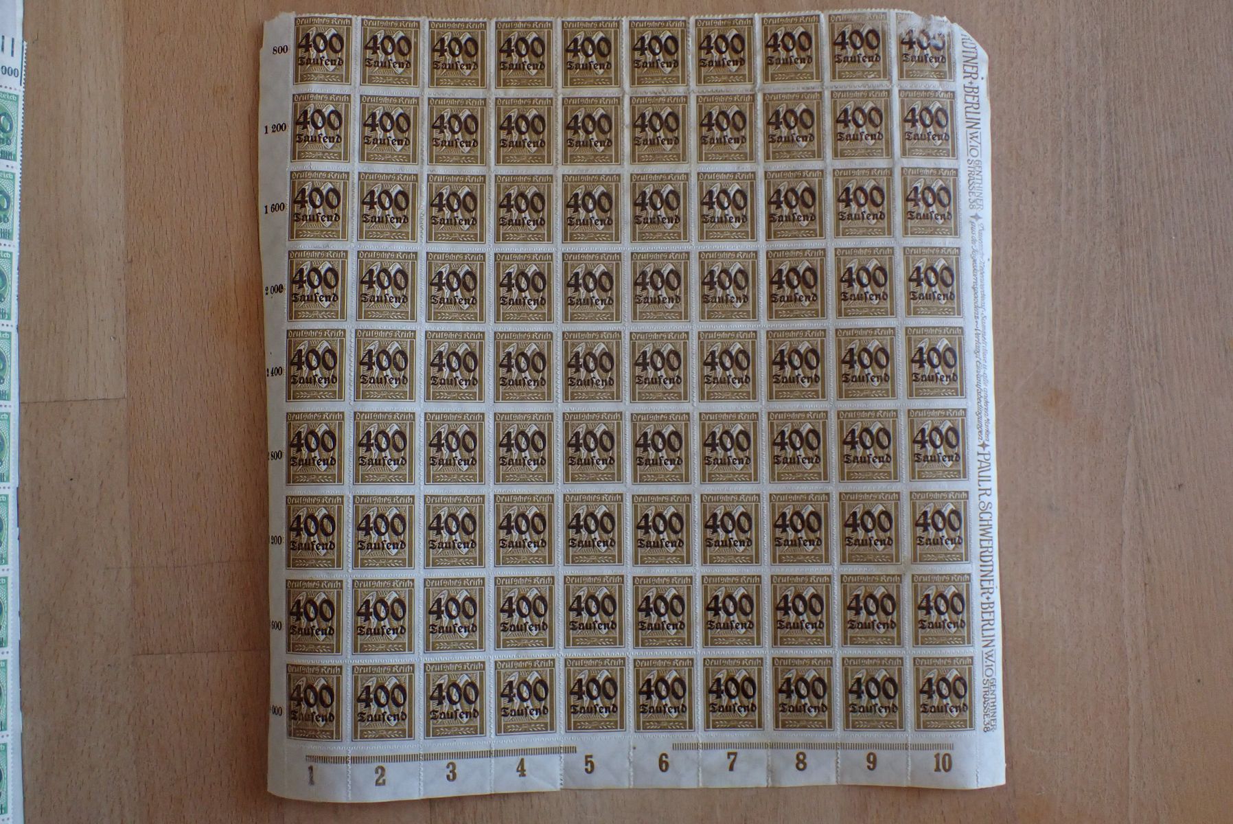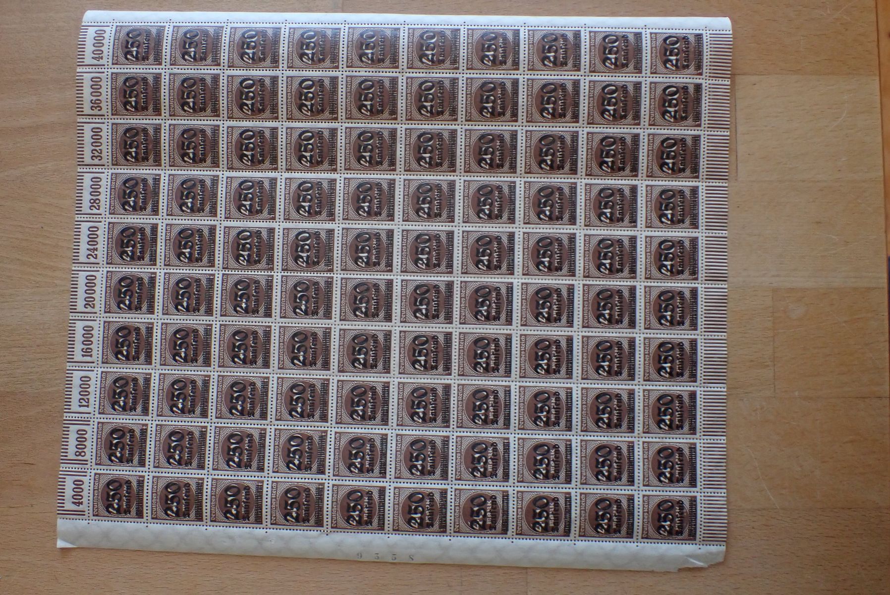 Alle Bögen von Infla Rosettenmuster 313-330 im Plattendruck haben alle die gleichen Plattenfehler und PE´s (4 x pro Schalterbogen). Die Einzelmarken haben einen viel höheren "Michelwert". Dennoch werden die Bögen von Privat und auch von Briefmarkenhändler für einen einstelligen Europreis in ebay verkauft und das auch noch in guter Erhaltung.