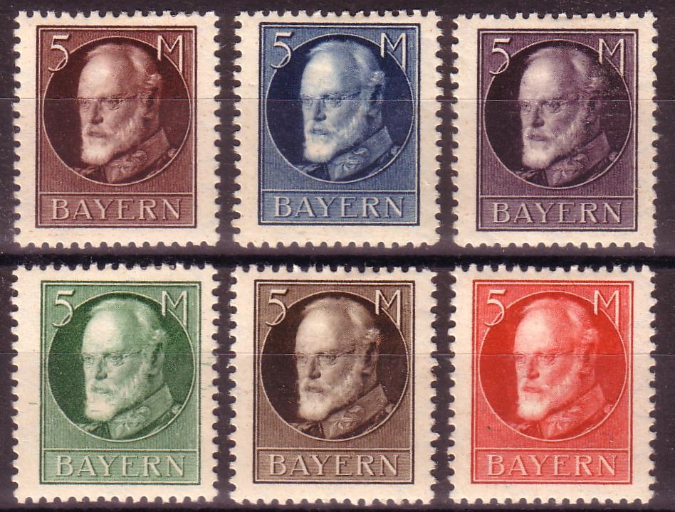 In diesem Fall 6 Stück verschiedenfarbige ludwig III Werte zu 5 MK, ich glaub es sind Probedrucke aber ob meine Rechere Michel 107 P ( in versch anderen Farben) stimmt?