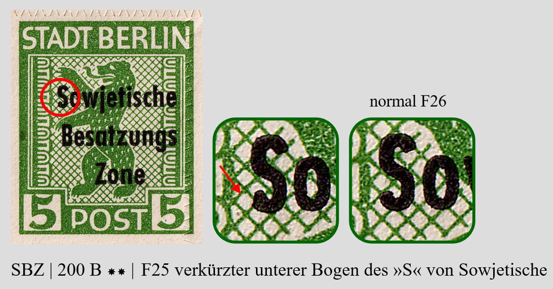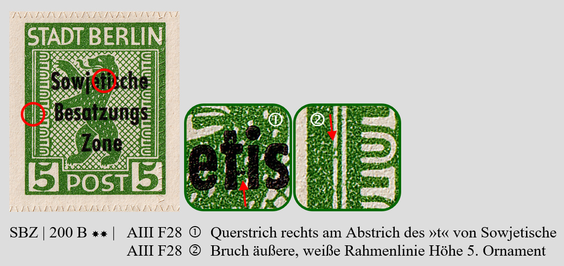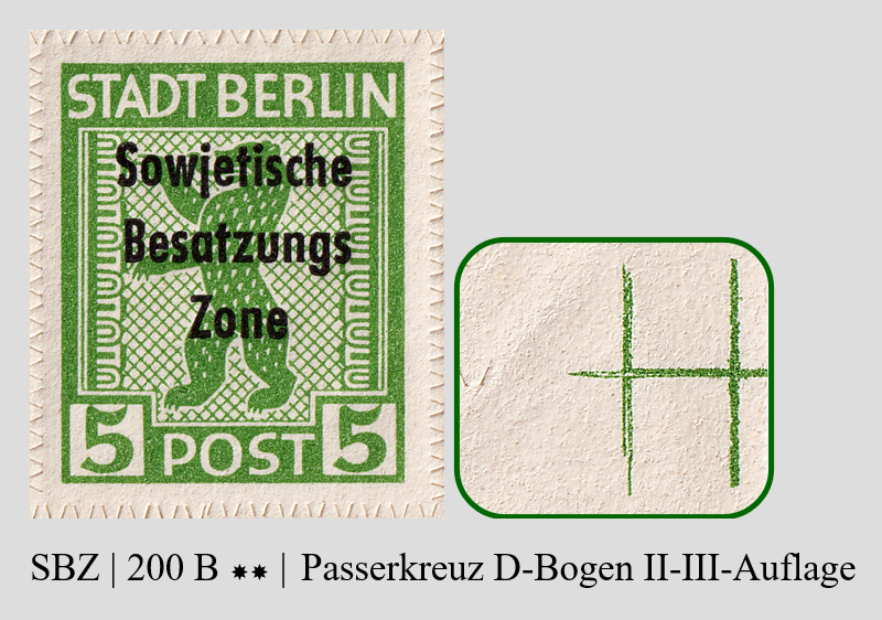 Habe nur wiederum bei einer Auktion einen vollständigen Schalterbogen der 200 B erhalten. Die Ausgabe 200 B ist insofern interessant, weil hier die Michel-Nr. 1 der Freimarken Berliner Bär und Eiche im September 1948 mit dem Aufdruck »Sowjetische Besastzungs- zone« im Buchdruck durch die Druckereien Giesecke & Devrient sowie Noack überdruckt wurden. Neben den Besonderheiten der Urmarken, kommen hier weitere, wie Plattenfehler des Buchdruckes hinzu.