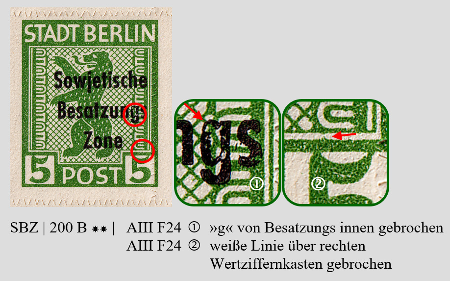 Habe nur wiederum bei einer Auktion einen vollständigen Schalterbogen der 200 B erhalten. Die Ausgabe 200 B ist insofern interessant, weil hier die Michel-Nr. 1 der Freimarken Berliner Bär und Eiche im September 1948 mit dem Aufdruck »Sowjetische Besastzungs- zone« im Buchdruck durch die Druckereien Giesecke & Devrient sowie Noack überdruckt wurden. Neben den Besonderheiten der Urmarken, kommen hier weitere, wie Plattenfehler des Buchdruckes hinzu.