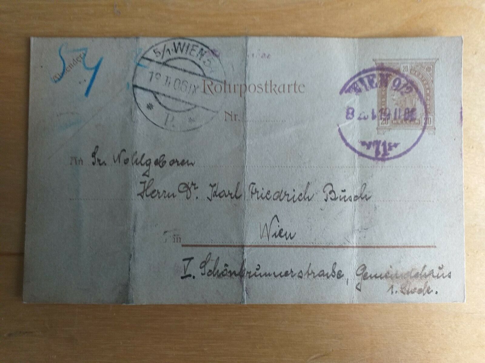 - Meine Überlegung wäre noch, ob das "W" evtl. eher eine auf dem Kopf geschriebene "11" sein soll, wobei mir dies eher seltsam vorkommen würde (noch nie ist mir eine umgedrehte Beschriftung begegnet)... Im einzigen Rohrpostnetz, das ich finden konnte (Stand 1907) würde diese Nummer auf die Station "Bräunerstraße" hinweisen. Jedoch weiß auch nicht, wie ich diese mit den übrigen Informationen zusammenbringen könnte: Die Stempel zeigen (soweit ich das erkennen kann) Wien 117 und die Telegraphenzentralstation. Außerdem ist die dem Schottenring nächstliegende Station die Telegraphenzentralstation, nicht die Bräunerstraße.