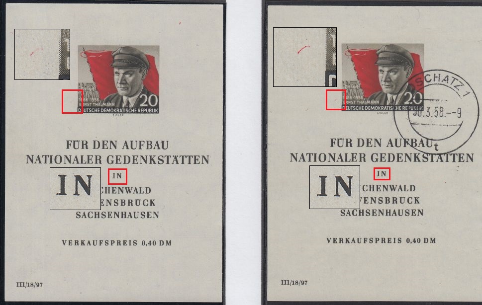 Hallo Hartmut, der Schrägstrich neben dem Druckvermerk ist bei meinen vorhandenen Blocks nicht vorhanden. Ebenso ist der kleine Fleck am "Ä" von "GEDENKSTÄTTEN" noch nicht in meinem Bestand.