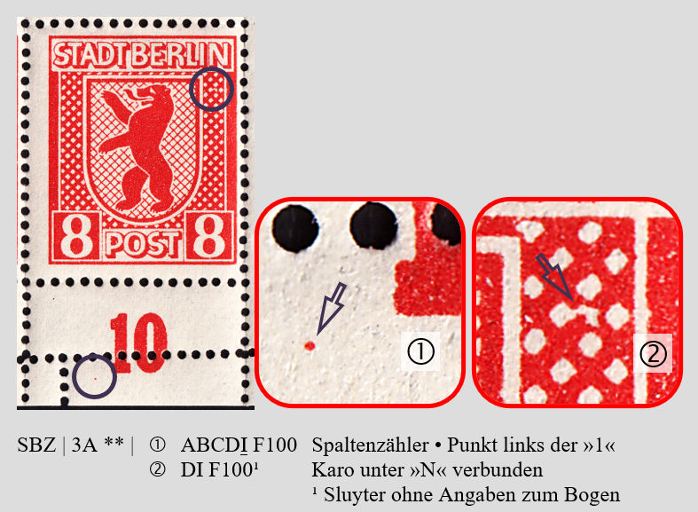 Schon kommt Bogenfeld F100. Dieses enthält beim Spaltenzähler »10« ein interessantes Merkmal. Denn es gilt für alle Bögen der Auflage I. Leider gibt es den Punkt vereinzelt auch in späteren Auflagen. Und es zeigt sich, dass Kataloge / Handbücher vollständig Bogenfelder beschreiben sollten. So findet sich zwar bei Sluyter mit der Nummer CLXXXXV die verbundenen Karo. Aber es fehlt dort die Angabe zu Bogen und Auflage. Es geht schon eine gehörige Zeit ins Land all diesen "freien" Feldnummern einen Bogentyp und eine Auflage zuzuordnen.