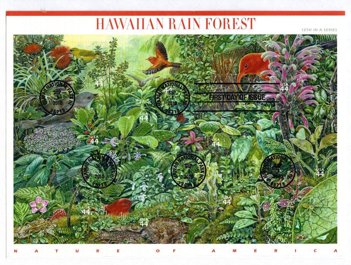 heute zeige ich mal etwas das erst kürzlich in die Sammlung kam. Es zeigt welche Bandbreite eine Hawaii-Sammlung haben kann. Ich rede hier hier natürlich nicht von der klassischen Sammlung. Aber schaut man mal über den Tellerrand so stolpert man auch über solch farbenfrohe Ausgaben. Hier finden sich 10 selbstklebende Ausgaben (USA MiNr.4632-41) auf einen Bogen mit dem Thema Hawaiianischer Regenwald. Ausgegeben wurde der großformatige Bogen im Jahre 2010 zu einem Nominalwert von 10 x 44c (4,40$) Auf der Rückseite werden auch die wichtigsten Vertreter der Flora und Fauna beschrieben. Abgestempelt wurde zum Ersttag natürlich auch auf Hawaii. Ich finde die Darstellung des Themas Regenwald in dieser Form eigentlich ganz gut gelungen und die Größe füllt auf jeden Fall komplett eine Albumseite!