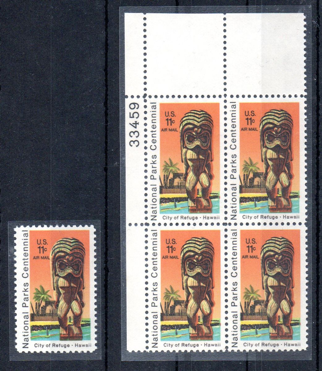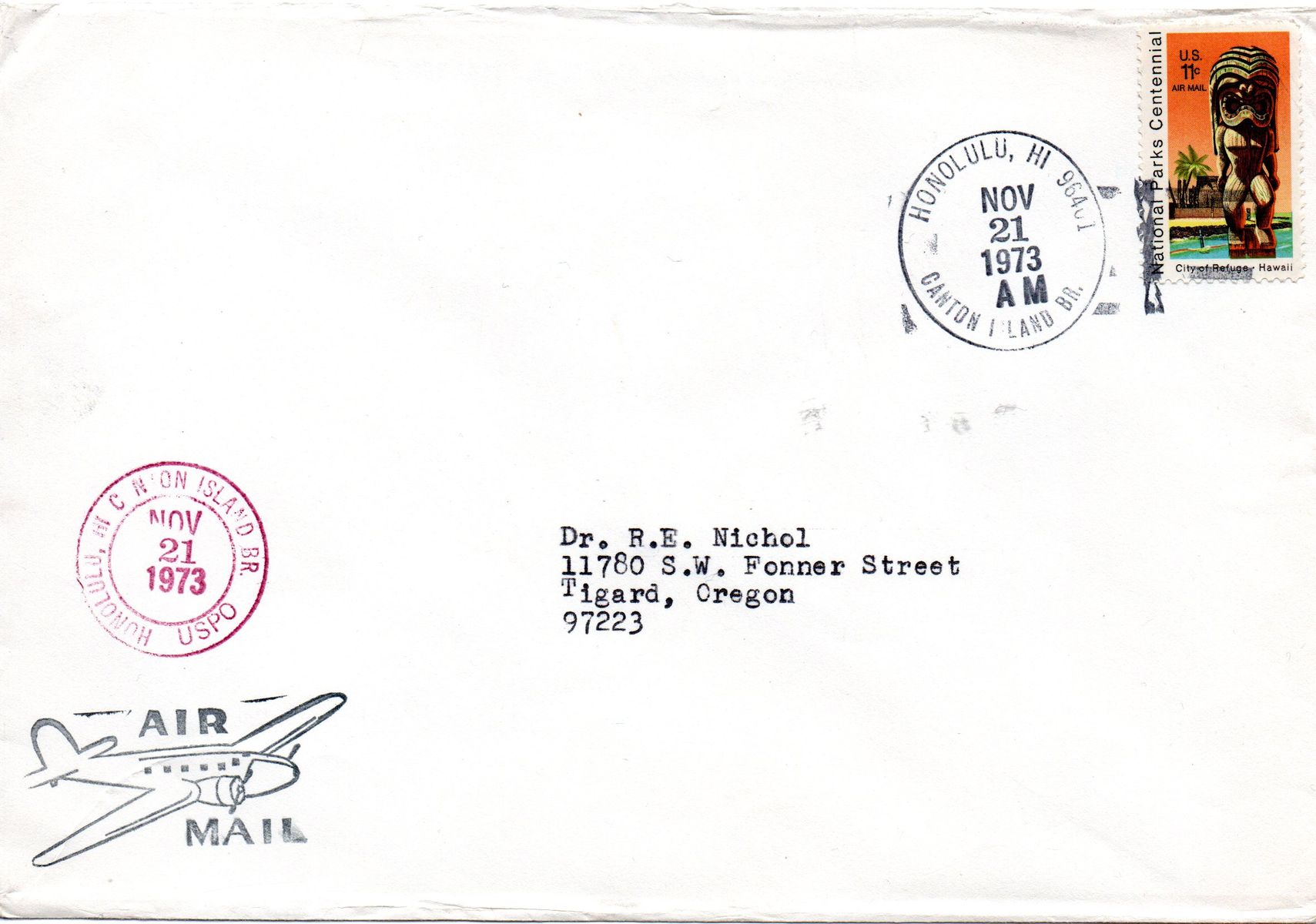 Aber weiter mit Hawaii. Zu einem früheren Zeitpunkt habe ich schon einmal die 11c Luftpostmarke Puʻuhonua o Hōnaunau National Historical Park aus dem Jahr 1972 (MiNr.1067 / Scott C84) erwähnt. Heute kann ich da neben der Einzelmarke einem Viererblock und FDC auch einen gelaufenen Beleg zeigen. Viererblocks vom Eckrand mit Bogennummern oder sonstigen Druckvermerken scheinen ja für Marken aus den USA in Mode zu sein. Das kommt mir als Freund von Bogenteilen natürlich sehr entgegen und macht die Beschaffung auch leichter. Der Beleg ist etwas exotisch und überschneidet sich doch glatt mit meinem Sammelgebiet der Gilbert und Ellice Inseln. Zwischen 1940 und 1979 gab es auf Canton Island eine amerikanische Post Office die in den letzten Jahren als Branch der Post Office von Honolulu betrieben wurde. Und genau von dieser Branch Post Office stammt mein Beleg. Die 11c entsprechen der Luftpostrate in die USA. Meines Wissens nach hatte die Post Office Honolulu noch andere Branchs in der Südsee. Einen Beleg für Christmas Island habe ich bereits in meiner Sammlung und auch schon im Thread zu den Gilbert und Ellice Inseln gezeigt.