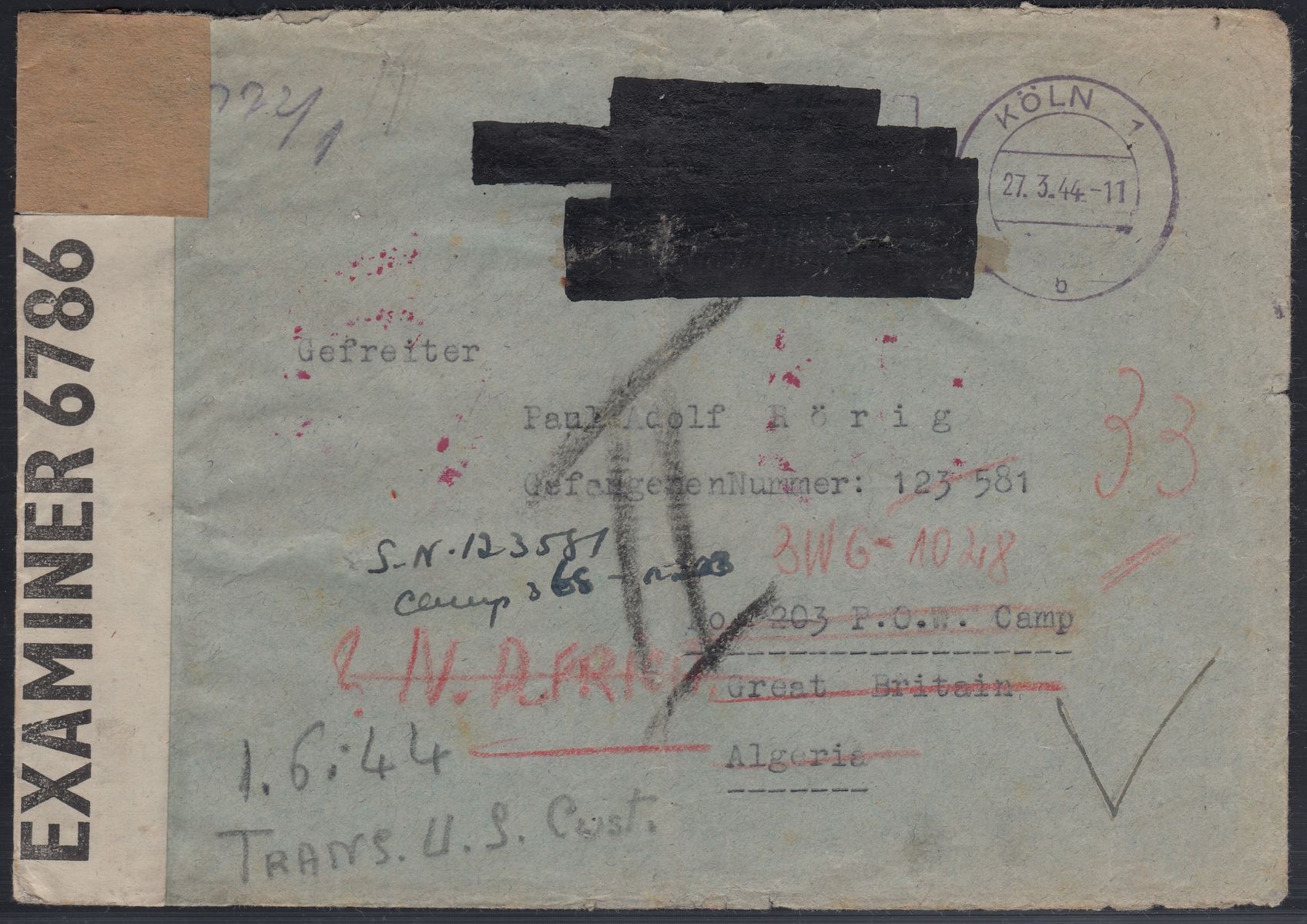 Zensurstreifen (nach Riemer: B 53a) und roter Briefstempel (nach Riemer: B 3a) der Wehrmacht (Auslandsbriefprüfstelle Berlin);