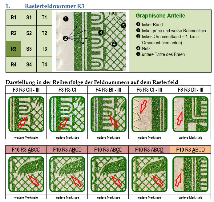 Die oben gezeigte Rasterfeldmethode fast alle Bögen zusammen. Also gibt es auch 4 Abbildungen zu dem Primärfehler bei F10. Am Beginn wird das Rasterfeld in seiner Lage eingeordnet. Es gibt auch eine Gesamtübersicht. Die einzelnen grafischen Elemente werden mit Namen benannt. Diese Bezeichnungen werden auch in dem Teil I verwendet. Hier ist der Michel-Spezial nicht mehr gleich. Einmal wird es Netz (1 A II) und einmal Gitter (1 A XXI) genannt. Es sollten schon gleiche Begriffe sein.