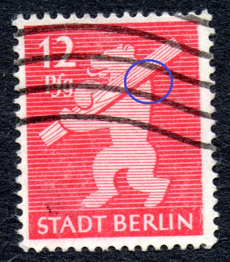 @Heliklaus, auch wenn ich schreibe, die 5 A ist nicht so mein Gebiet, kann ich Dir und anderen natürlich auch 'ne kleine Bestimmungshilfe anbieten. Die 12 Pfg.-Marke hat sechs Primärfehler. Die streuen etwas über den Bogen. Aber da kann man das Bogenfeld schon mal begrenzen.