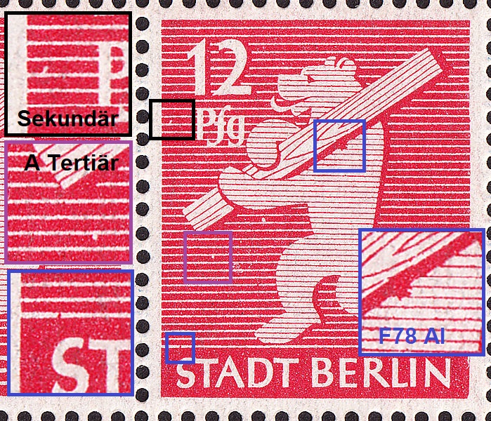 @Heliklaus, auch wenn ich schreibe, die 5 A ist nicht so mein Gebiet, kann ich Dir und anderen natürlich auch 'ne kleine Bestimmungshilfe anbieten. Die 12 Pfg.-Marke hat sechs Primärfehler. Die streuen etwas über den Bogen. Aber da kann man das Bogenfeld schon mal begrenzen.