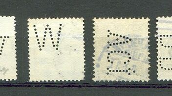 Ich habe in Kiloware dieses StĂĽck gefunden wo die Marken in der Form eines stilisierten Balkenkreuzes gelocht sind, am deutlichsten auf der rechten Marke zu sehen (bekomme leider keinen besseren Scan hin). Kann mir bitte jemand sagen ob es sich hierbei um eine Firmenlochung handelt oder was sonst.