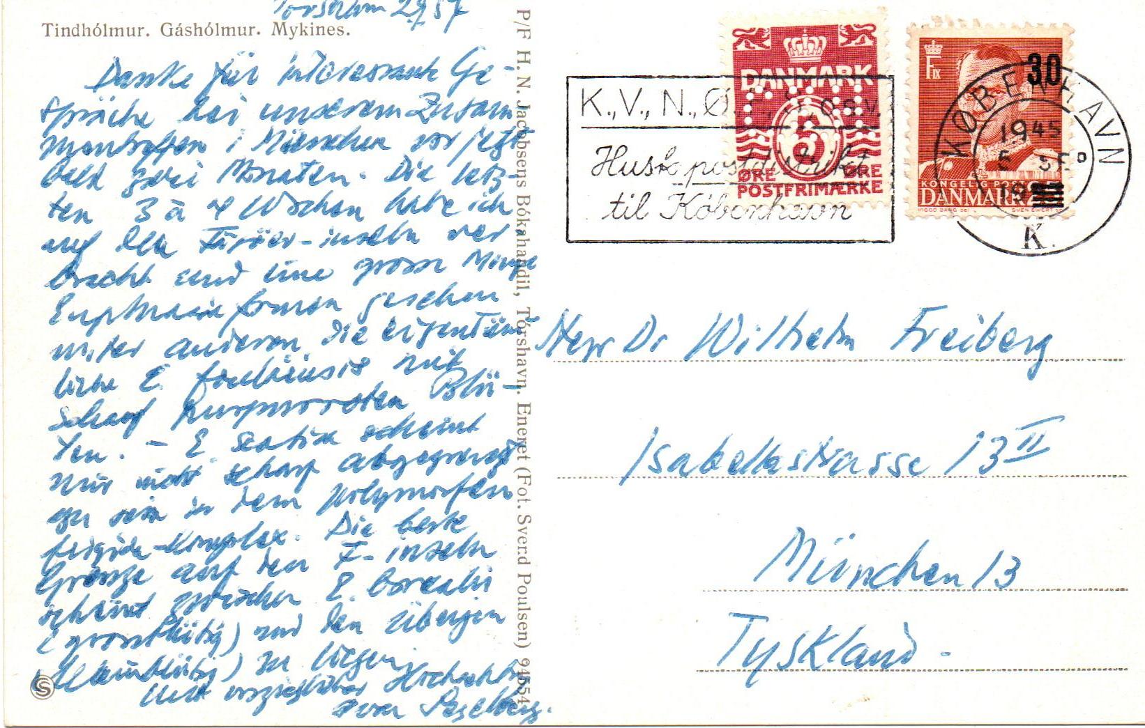 heute zeige ich eine Ansichtskarte von den Färöer-Inseln die wohl an Bord eines Schiffes auf dem Weg von Thorshavn nach Kopenhagen geschrieben wurde und deshalb auch in Kopenhagen abgestempelt wurde. Frankiert mit einer 5 Öre und einer 30 Öre Marke. Die 5 Öre Marke weist die Lochung C.K.H. auf, dies steht für C. K. Hansen, eine Reederei deren Schiffe offenbar auch diese Route befuhren. Perfins auf privater Korrespondenz sind selten.