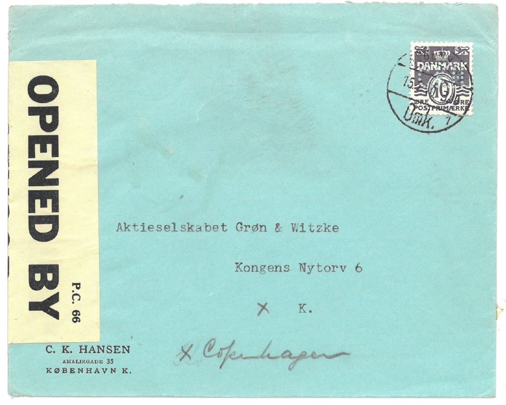 Es geht um einen Brief von 1940 mit einer 10 øre Wellenlinie mit dem Perfin "C.K.H." auf einem Firmenumschlag von C. K. Hansen, versendet am 15.01.1940 von Kopenhagen nach Kopenhagen. Der Brief ging an die Aktiengesellschaft Grøn & Witzke. Kongens Nytorf ist ein bekannter Platz in Kopenhagen.