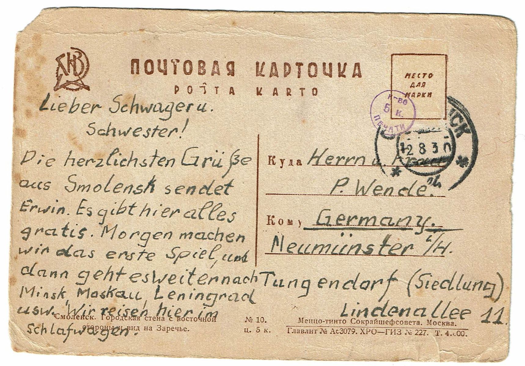 Übrigens interessant, daß unter dem russischen Text für "Postkarte" die Benennung "POŠTA KARTO" in Esperanto vorgedruckt ist.