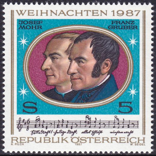 bei den Österreichern wird man wohl schneller fündig als bei deutschen Marken. Hier die Weihnachtsmarke von 1987 mit Mohr und Gruber, der Text "Stille Nacht" ist in Sütterlin geschrieben.