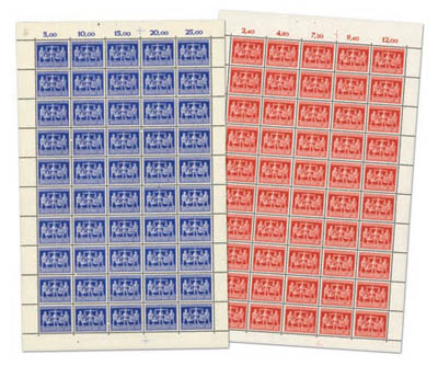 Die Marken zur Exportmesse Hannover 1948, Nr. 969 / 970, wurden in Bogen zu 50 Exemplaren und auch in Zusammendruckbogen zu 25 Viererblocks in schachbrettartiger Anordnung (100 Bogenfelder) gedruckt. Es ergeben sich daraus jeweils vier verschiedene Zusammendruckkombinationen waagerecht und senkrecht, sowie zwei verschiedene Viererblocks.