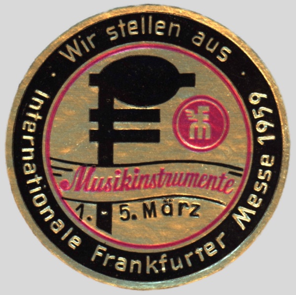 Auf der Frankfurter Frühjahrs- oder Herbstmesse gab es für die verschiedenen Branchen Schwerpunkte. Neben Hauswirtschaftswaren, Textilien, Bürobedarf, Papier- und Spielwaren gab es auch einen eigenen Schwerpunkt auf die Ausstellung und den Verkauf von Musikinstrumenten. Die Sparte Musikinstrumenten soll auf der Herbstmesse 1952 geringere Resonanz gefunden haben. Aus diesem Grund scheint die Ausstellung der Sparte Musikinstrumente in den Folgejahren in die Frühjahrsausstellung verlegt worden zu sein, wie man anhand der hier gezeigten Werbemarken nachvollziehen kann. Diese Marken wurden von Ausstellern auf ihrer Geschäftskorrespondenz benutzt, um auf ihre Teilnahme an der Messe hinzuweisen. Zwischen den Ausgaben der verschiedenen Jahre gibt es nur geringe farblich und gestalterische Unterschiede.