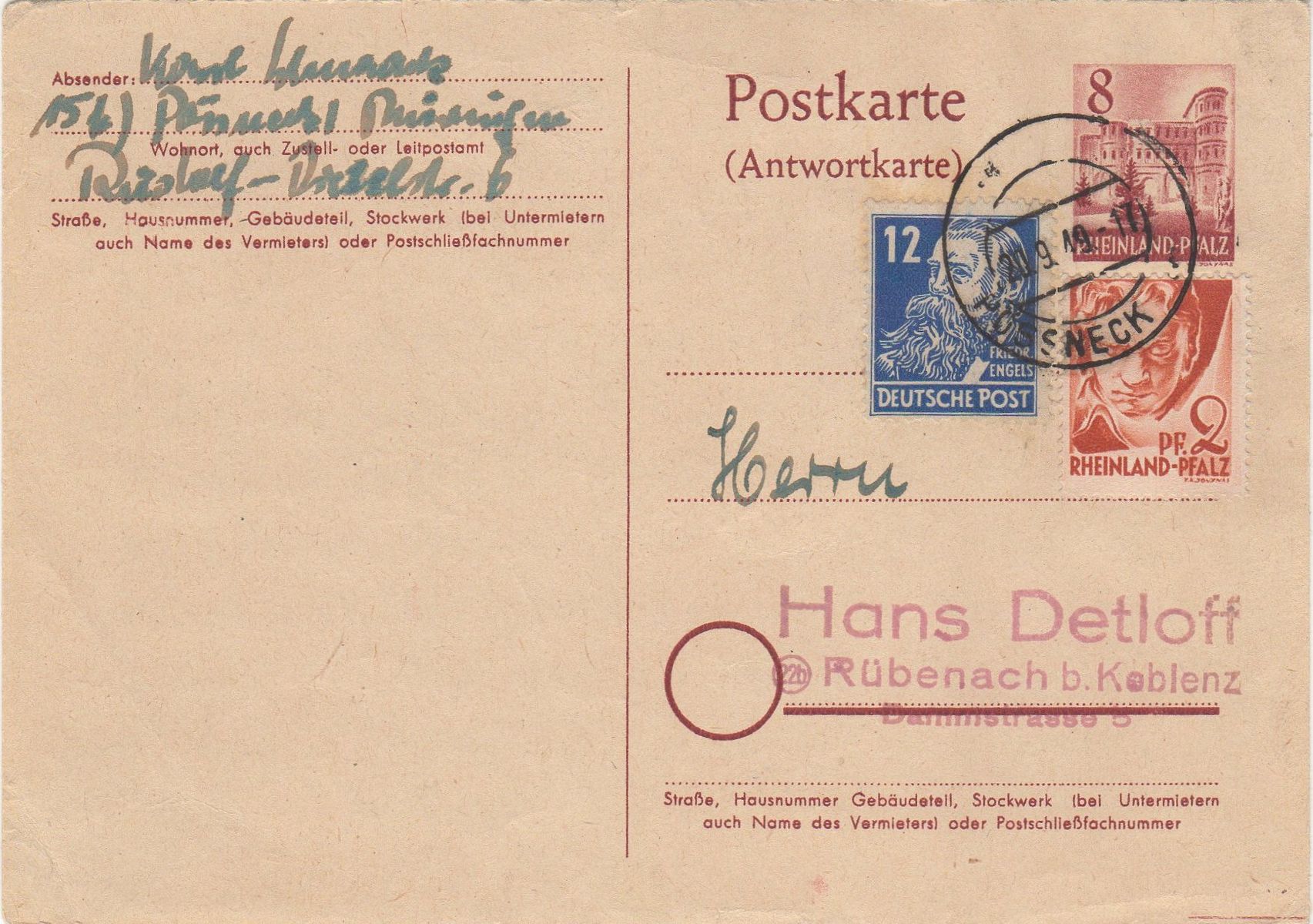 Der Absender dieser Postkarte mit Antwort hat eine 2 Pfg Zusatzfrankatur vorgenommen Porto für Postkarten im Fernverkehr!