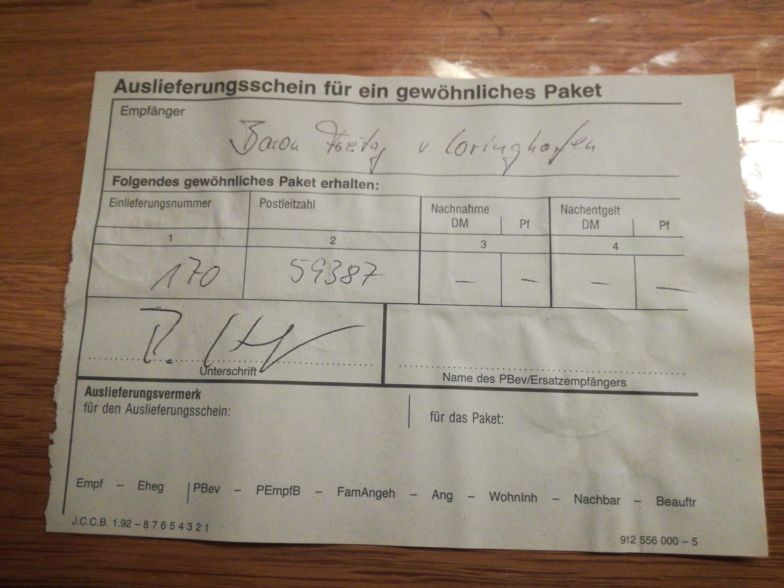 aus dem Jahr 1995 habe ich hier Auslieferungsscheine für ein gewöhnliches Paket.