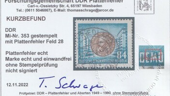 Gerne nimmt die Forschungsgemeinschaft auch kostenlose Prüfungen von DDR-Plattenfehlern vor, die entweder im MICHEL-Spezial oder in unseren Katalogen zu finden sind. Es folgt hier aber keine Signierung oder ein Fotoattest.