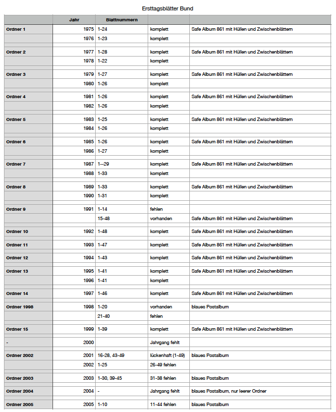 1. ETB's Bund 1975-1997 und 1999 in Safe Ordner Typ Variant (Ordner in unterschiedlichen Farben), die Jahrgänge 1998, 2002-2005 befinden sich in blauen Ordner der "Deutschen Post" inclusive Schutzhülle. Aufbewahrt sind die ETBs in 15 x Safe Variant Ordner (unterschiedlichen Farben) und in 5 blauen Ordner der "Deutschen Post".
