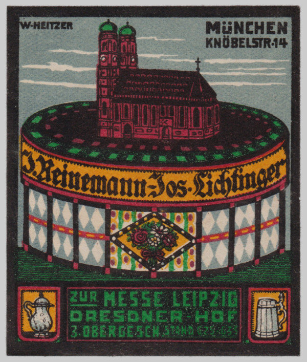 Auf einer bunt gestalteten Dose die Münchener Kirche „Dom Zu Unserer Lieben Frau“ (Frauenkirche); oben am Dosenrand die Inschrift des Firmennamens „J. Reinemann – Jos. Lichtinger“, unten im Feld der Anlass und die Standdaten der Zinngießerei auf der Leipziger Frühjahrsmesse, links davon ein Zinnkrug, rechts davon ein Bierkrug. Am oberen linken Rand die Signatur des Künstlers „W.Heitzer“, am oberen rechten Rand die Firmenadresse.