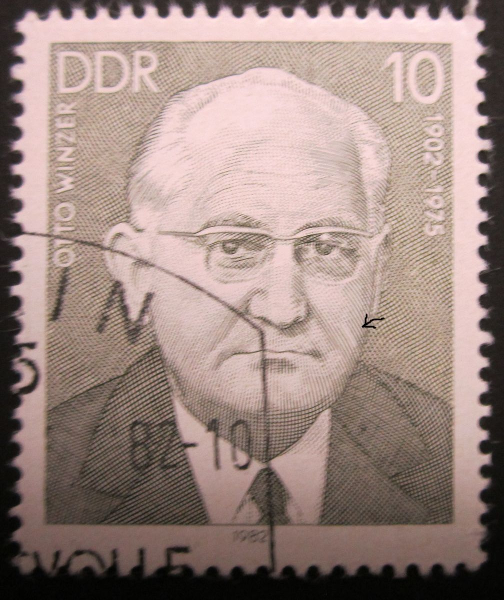 An meiner Fototechnik muss ich noch arbeiten. Bei der Otto Winzer Marke ist im Orginal der feine Schnitt an dieser Stelle zu sehen. Hat also nichts mit der abspringenden Farbe zu tun, was beim Sticheltiefdruck immer eine Gefahr ist.
