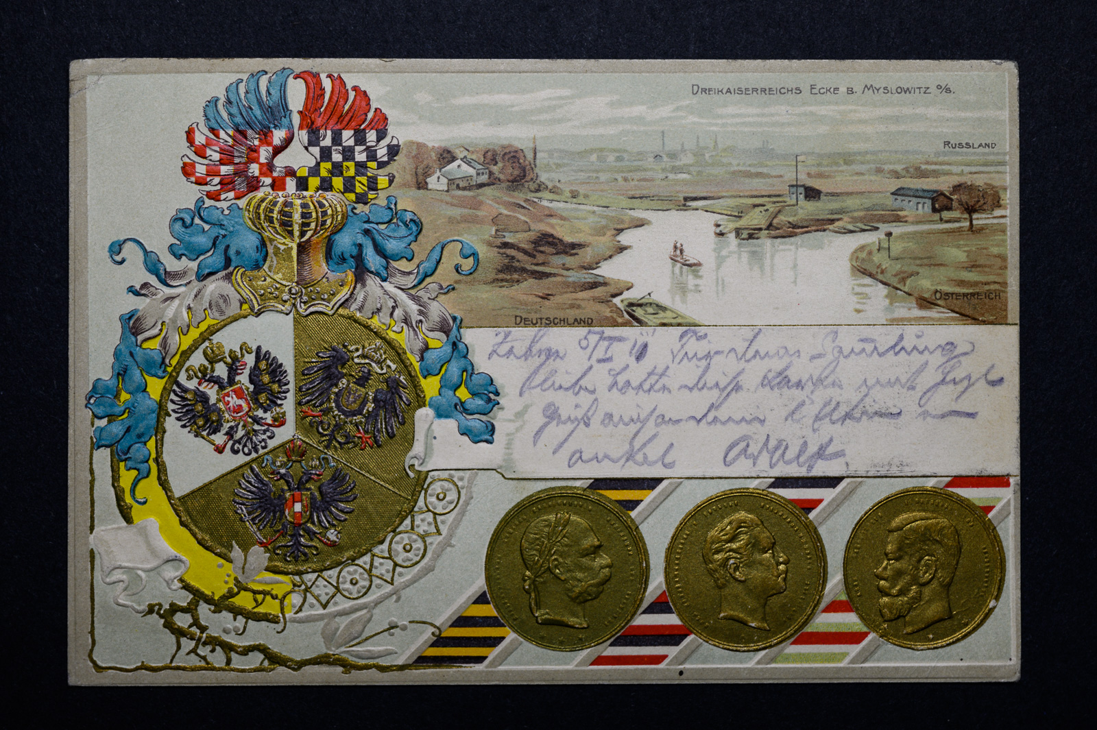 Hier noch eine echt gelaufene AK. Nur die deutsche Marke ist mit Myslowitz gestempelt, die russische und österreichische Marke ist nur Beiwerk und wurde nicht extra mitgestempelt.