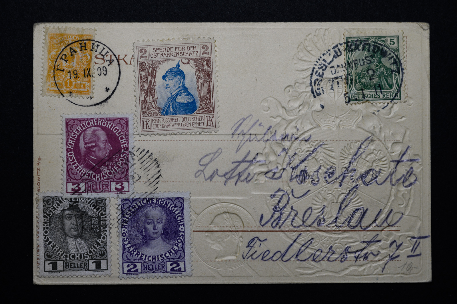 Das Motiv der Karte ist ja die Dreikaiserreichsecke, also der Ort an dem Deutschland, Österreich und Russland aneinander stiessen. Als touristisch-philatelistisches Souvenir hat man dann passend Marken der drei Länder aufgeklebt (übrigens keine besonders attraktive Auswahl). Die Ostmarkenschatzvignette hatten wir schon im Forum. Sie ist also mit der Suche zu finden.