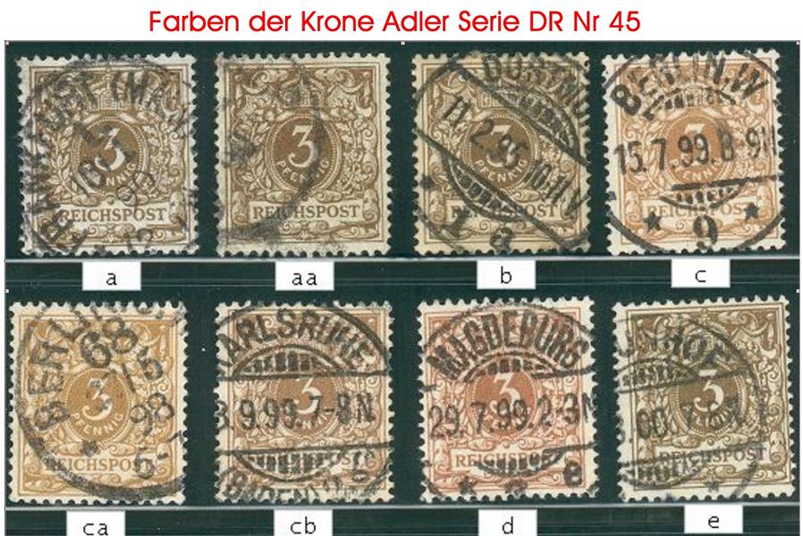 1. Zeile: 45a (gelblichbraun), 45aa(dunkle(gelblich)braun), 45b (mittelbraun), 45c (hellockerbraun) und 45ca (hellocker), die letzte Marke lt. Jäschke-Lantelme etwas verfärbt.