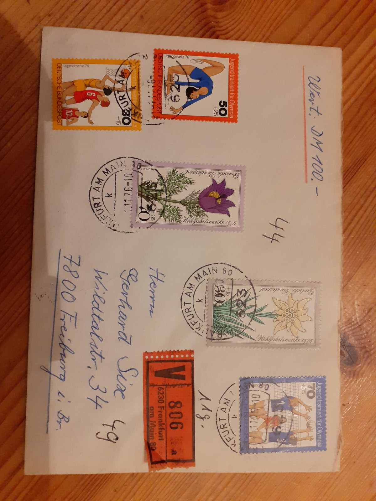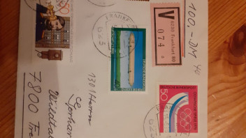 Mi-Nr. 867, 870, 882, 884 und 885 auf Wertbrief (11g) innerhalb Deutschlands gelaufen am 1.11.1976. Das nötige Porto von 2,50 DM setzt sich zusammen aus 50 Pfennig für den Standardbrief und 2 DM für den Wertbrief (Wert bis 500 DM). Der Brief ist somit portorichtig frankiert. Die höherwertigste Marke auf Brief ist die Mi-Nr. 870 (als MiF: 3,- Mi€). Hinzu kommt dann noch der Michel-Preis für die vier anderen Einzelmarken (insgesamt 3,70 Mi€). Somit hat der Beleg mit seinen schönen, sauberen Tagesstempeln einen Katalogwert von 6,70 Mi€ (meine Kataloge sind nicht aktuell, Preise können abweichen).