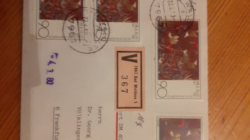 Mi-Nr. 1029 als 4-fach-MeF auf Wertbrief (18g) innerhalb Deutschlands gelaufen am 22.2.1980. Das nötige Porto von 3,60 DM setzt sich zusammen aus 60 Pfg. für den Standardbrief und 3,- DM für den Wertbrief bis 500,- DM. Somit handelt es sich hier um eine portorichtige Mehrfachfrankatur (MeF x4). Die MeF ist im Michel mit 35,- Mi€ bewertet, hinzu kommt 3x der normale Katalog-Wert, also insgesamt 2,10 Mi€. Somit ist man bei einem Katalogwert von 37,10 €. Allerdings ist dies der einzige der Belege, bei denen ich tatsächlich auch einen echten Handelswert sehe. Bei Verkauf über ebay sollten 5-8 Euro drin sein.
