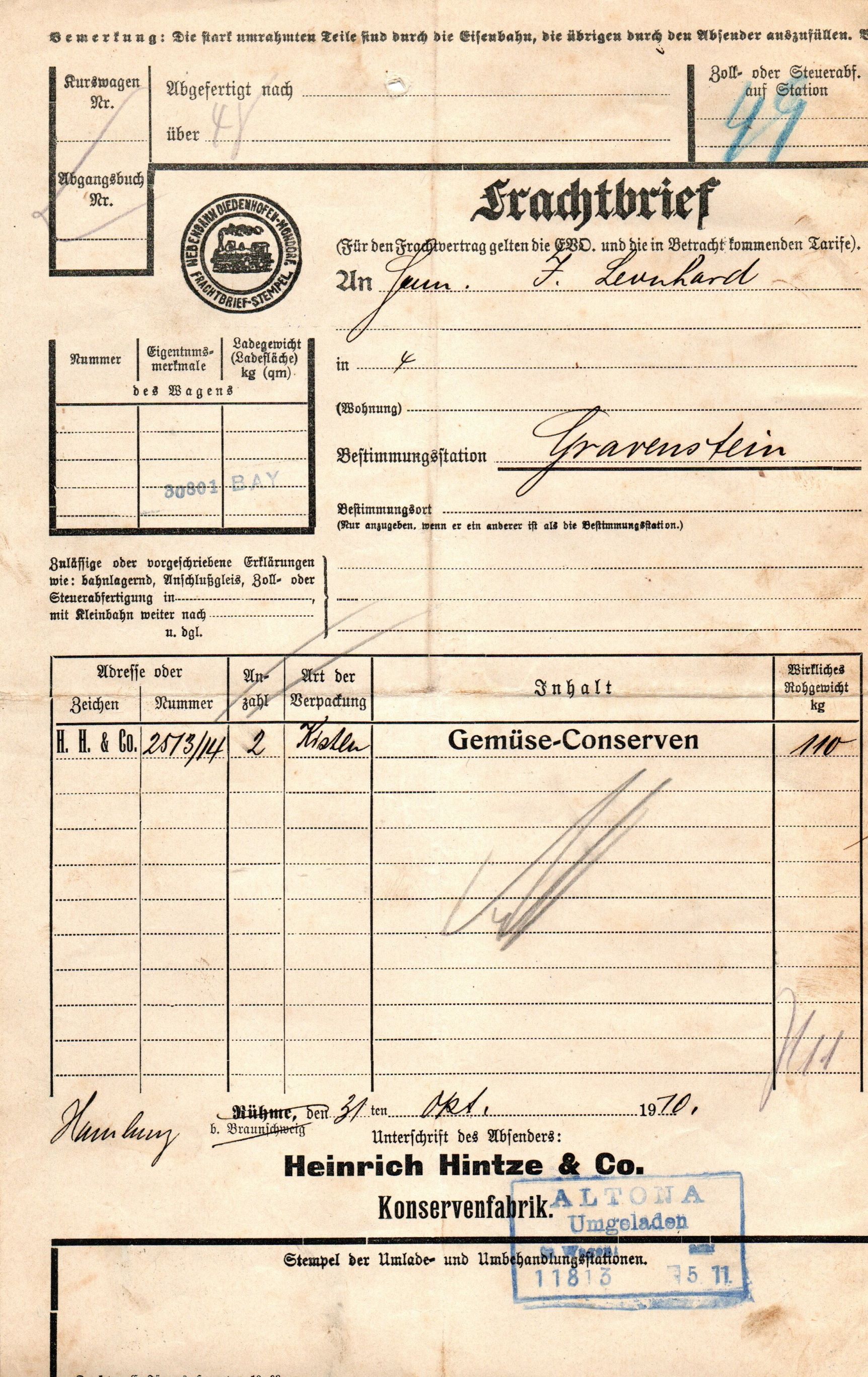 Zu diesem Frachtbrief: Eine Ladung Gemüse-Conserven aus Hamburg nach Gravenstein im damals noch deutschen Nordschleswig. Aufgegeben und gewogen in Hamburg-Barmbek am 4.11.1910. Am 15.11. im damals noch selbständigen Altona umgeladen und am ?7.11.10 in Gravenstein angekommen.