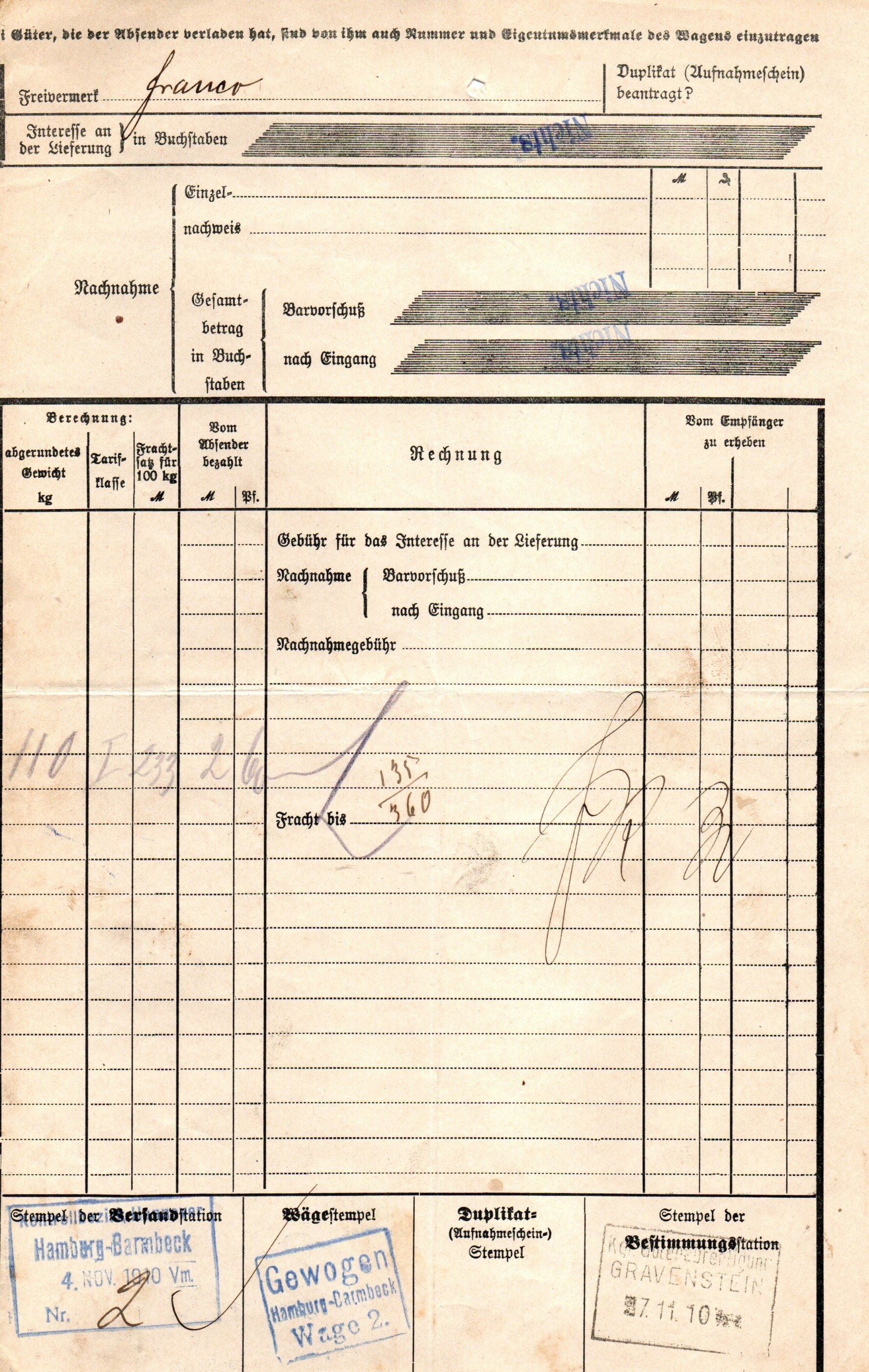 Zu diesem Frachtbrief: Eine Ladung Gemüse-Conserven aus Hamburg nach Gravenstein im damals noch deutschen Nordschleswig. Aufgegeben und gewogen in Hamburg-Barmbek am 4.11.1910. Am 15.11. im damals noch selbständigen Altona umgeladen und am ?7.11.10 in Gravenstein angekommen.