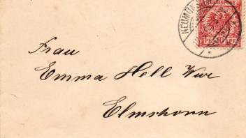 Mein Minibriefchen (10,8 x 6,8cm) lief von Neumünster nach Elmshorn. Empfängerin war die Witwe Emma Hell, ich vermute mal die Inhaberin des Café Hell in der Königstraße.