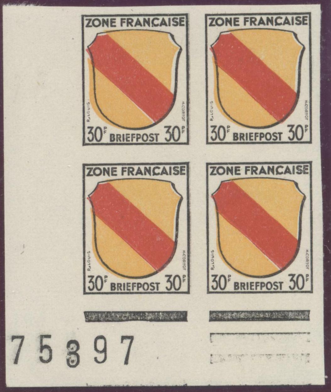 30 Pfg ungezähnter Eckrandviererblock Bogennummer 75397