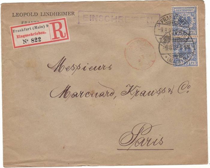 Frankiert mit je einer 20 Pfg. Krone/Adler und einer 40 Pfg. Germania Reichspost. Entspricht 20 Pfg. Auslandsbriefporto + 20 Pfg. Auslandseinschreibegebühr + 20 Pfg. Auslandsrückscheingebühr.