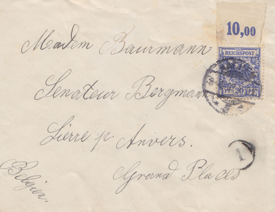 Es handelt sich um einen Brief aus Hamburg nach London aus dem Jahr 1892. Frankiert mit einer 20 Pfg Krone/Adler violettultramarin (Mi. 48d, farbbestimmt). Die Marke wurde mit dem KOS "Hamburg-Uhlenhorst 27.6.92 8-9N" entwertet.