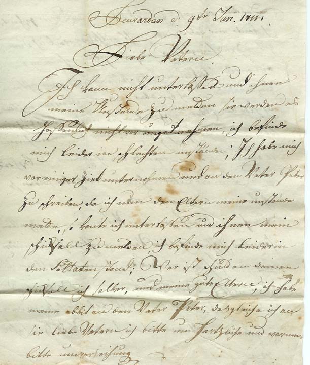 Da ist kein Stempel vorhanden, aber das Datum Im Brief ist sehr deutlich. Geschrieben am 9. Januar 1811. Geschrieben von einem schweizer Söldner im Dienst von Napoleon, stationiert in Holland, adressiert nach Mitlödi/GL.
