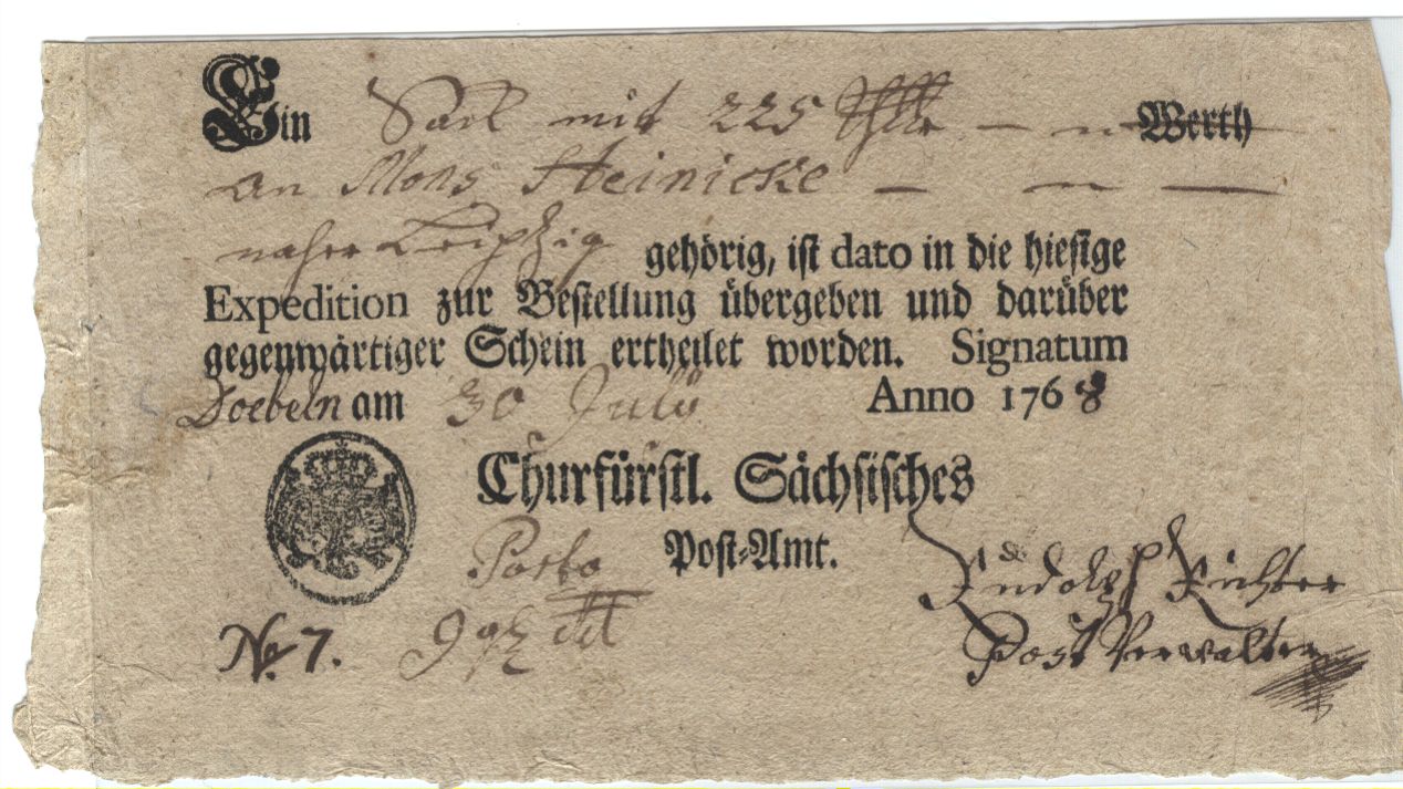 Na dann ab nach 1768 noch ein Postschein, aus Döbeln