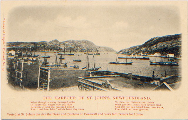 Auf einer Reise durch das Britische Empire besuchten der Herzog und die Herzogin von Cornwall und York unter anderem auch Canada und Neufundland. Der Kartenverlag E. Wrench gab dazu eine Anzahl von Ansichtskarten heraus, die letzte von St. John`s auf Neufundland. Diese Karte, die leider nicht gestempelt vorliegt, müßte von 1901 sein, da die beiden Reisenden in diesem Jahr Canada wieder verließen Richtung Heimat nach Abschluß ihrer Reisen. Die Karte könnte somit zu den ältesten von Neufundland zählen. Nachzulesen hier: