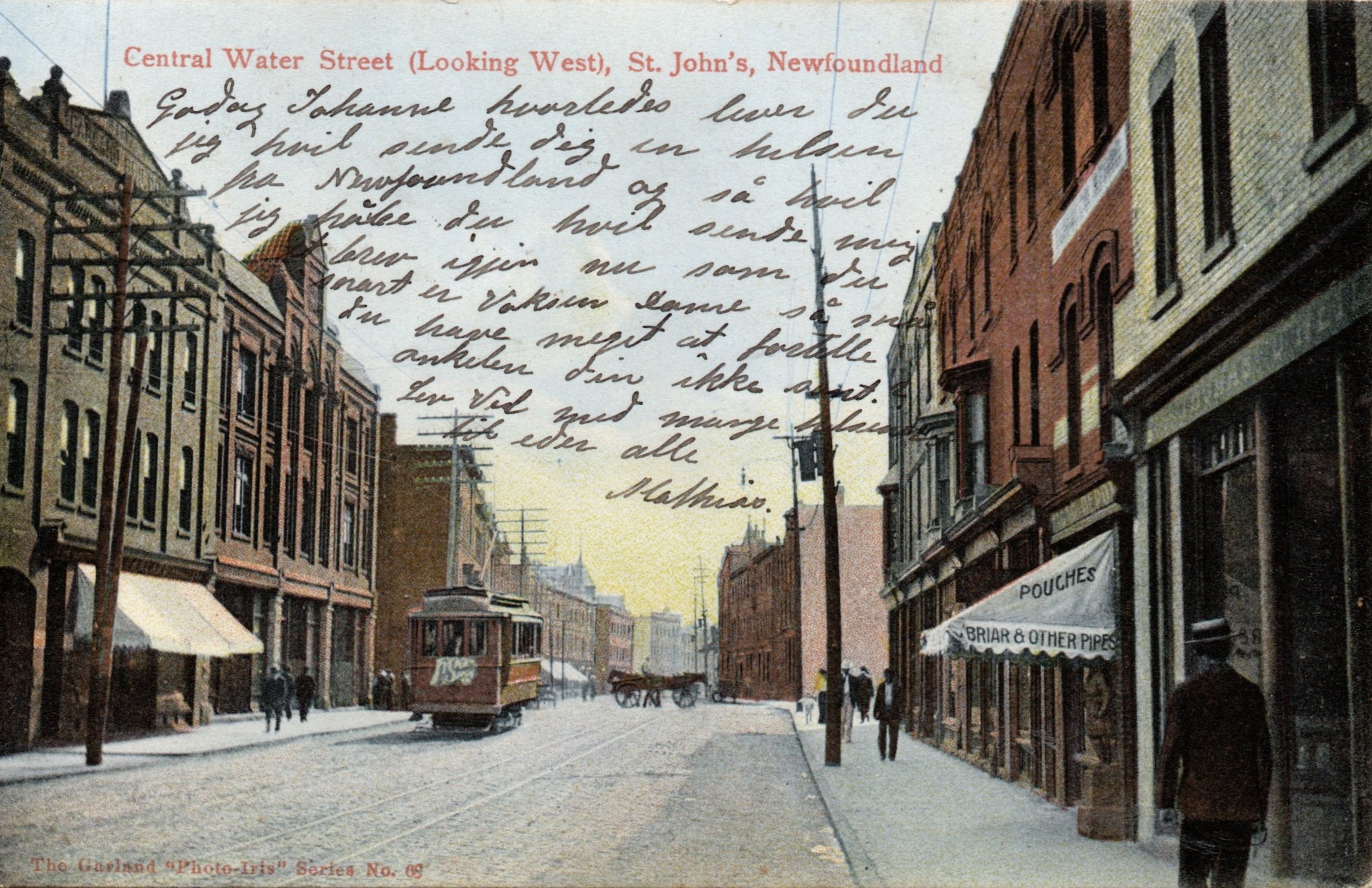 eine nach Norwegen gelaufene Ansichtskarte aus St. John's aus dem Jahr 1907. Sie zeigt die Hauptgeschäftsstrasse der Hauptstadt Neufundlands die Water Street von St. John's. Fünfzehn Jahre nach dem verheerenden Brand von 1892 sieht man natürlich keine Spuren mehr.